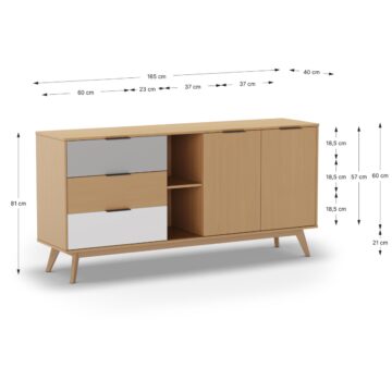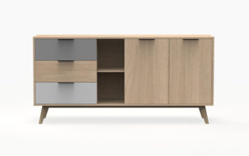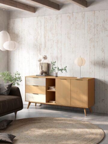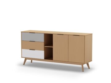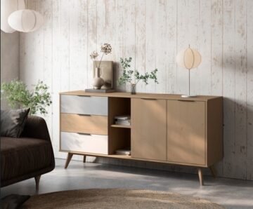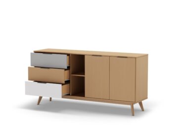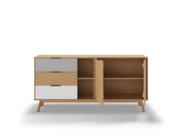 Komoda se savršeno uklapa u različite prostore, poput dnevnog boravka, spavaće sobe ili blagovaonice. Kombinacija zatvorenog i otvorenog prostora za pohranu omogućuje izlaganje dekorativnih predmeta, dok istovremeno omogućuje diskretno spremanje drugih stvari.