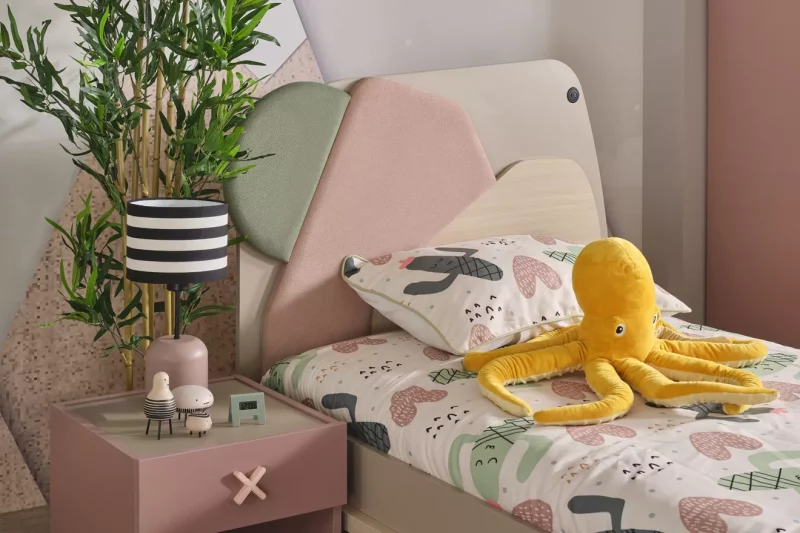 Mladenački krevet Nora iz kolekcije dječjih i mladenačkih soba Nora pretvara dječju ili mladenačku sobu u ugodno utočište za odmor i opuštanje. Moderan dizajn s razigranim elementima i toplim kombinacijama bež, ružičaste i zelene stvara ugodnu i smirujuću atmosferu. Krevet je dizajniran da spoji udobnost, funkcionalnost i modernu estetiku.