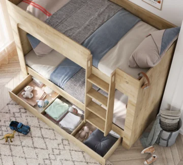 Krevet na kat Mocha svojim kompaktnim dizajnom učinkovito koristi prostor u malim sobama, a robusna konstrukcija i sigurnosne značajke čine ga jednim od najboljih izbora među krevetima na kat. S dimenzijama 90 x 200 cm nudi puno prostora za spavanje gore i dolje. Bočne ograde, stepenice i zaobljene linije osiguravaju sigurnu upotrebu za djecu. Dodatna ladica ispod kreveta na kotačima može služiti kao dodatni prostor za pohranu.