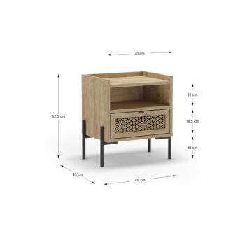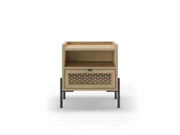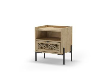 Noćni ormarić Inca spaja toplinu prirodnog izgleda hrasta sa suvremenim dizajnom. Zahvaljujući perforiranoj fronti i povišenoj konstrukciji, savršen je izbor za minimalističke, a funkcionalne spavaće sobe. Ormarić nudi otvorenu policu i ladicu s tihim zatvaranjem za pohranu osobnih predmeta.