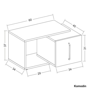 Dimenzije: širina 66 cm, dubina 56 cm, visina 37 cm. Kompaktne dimenzije omogućuju da se ormarić lako smjesti uz krevet, a istovremeno ima dovoljno prostora za odlaganje noćnih potrepština.
