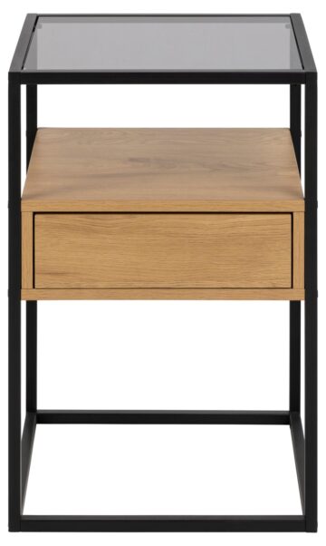 Noćni ormarić Randolf savršen je izbor za modernu spavaću sobu, koji kombinira funkcionalnost i stil. S kvadratnim čeličnim okvirom i površinom od dimljenog kaljenog stakla, ovaj ormarić donosi industrijski izgled s daškom elegancije. Površina od stakla idealna je za izlaganje knjiga, biljaka ili drugih dekorativnih predmeta, dok predal s funkcijom “push-to-open” omogućava skladištenje osnovnih stvari. Polica u izgledu divljeg hrasta dodaje prirodan štih koji se savršeno uklapa u moderni dizajn.