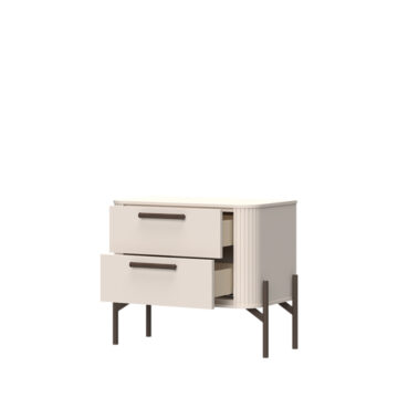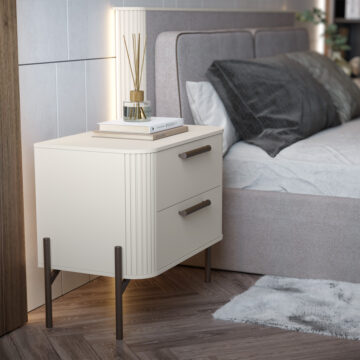 Noćni ormarić iz kolekcije RONDO ističe se bezvremenskom elegancijom i vrhunskom izradom. Fronta ladice izrađena je od MDF ploče debljine 18 mm i obostrano lakirana UV lakom u sofisticiranom dekoru kašmir mat, koji prostoru daje osjećaj smirenosti i profinjenosti. Gornja ploča ormarića dodatno je ojačana, čime se povećava čvrstoća i stabilnost namještaja.
