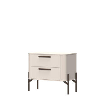 Ormarić je opremljen metalnim ručkama i nogicama u ekskluzivnoj boji Midnight Cooper – tamnoj, metalik nijansi koja se diskretno presijava i dodatno oplemenjuje njegov izgled. Soft-close sustav omogućuje tiho i kontrolirano zatvaranje ladice, što produljuje vijek trajanja mehanizama i povećava svakodnevnu udobnost.