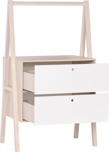 Nekonvencionalni noćni ormarić odlikuje suvremeni stil sa daškom nježnosti. Ormarić ima od drva napravljeno postolje, koje je rahlo više od uobičajnog. Dvije ladice kontrastične su bijele boje, a ostali okvir je u furniru od bagrema. Za šipku možete dokupiti spremnike.