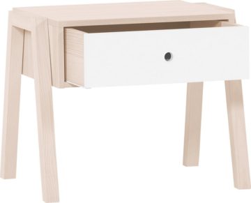 Noćni ormarić Spot izrađen je u univerzalnom stilu. Furnir bagrema i bijela ladica stvaraju nježan i fleksibilan izgled. Izrađen je od oplemenjene iverne ploće zaštićene melaminom i drva.