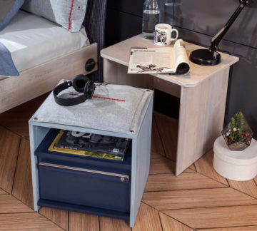 Noćni ormarić Trio se sastoji od ormarića i male klupe sa jastukom. Klupa se po potrebi lako izvlači iz ormarića. Također ima ladicu sa ručkom, koja se mekano zapira. Ormar je zaštićen sa melaminom, koji je otporan na ogrebotine i prašine.