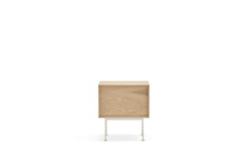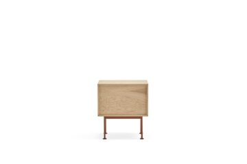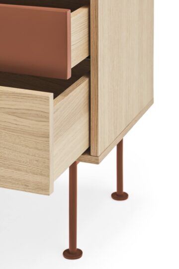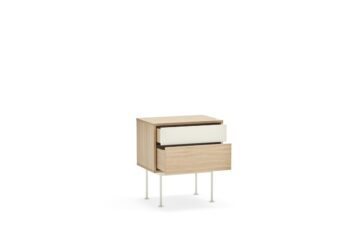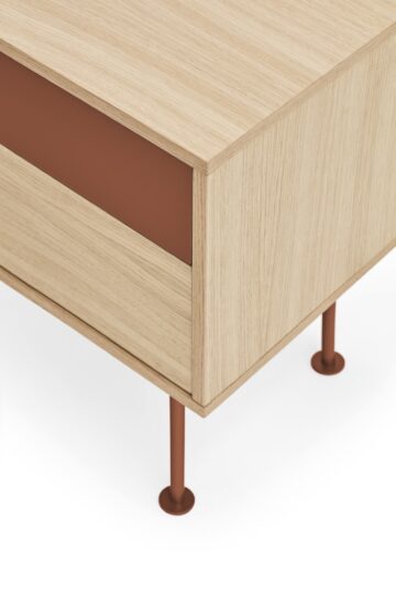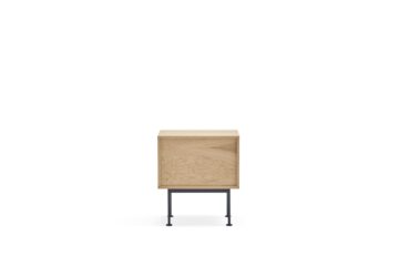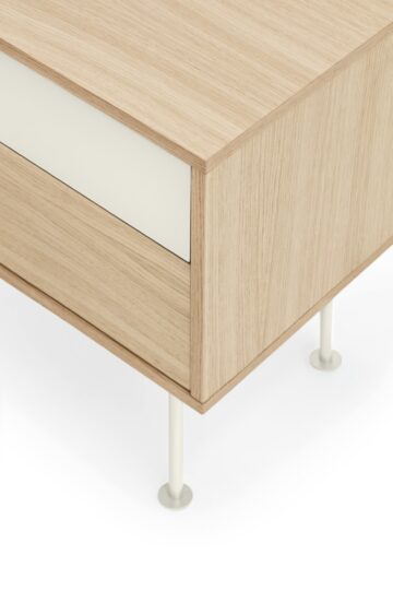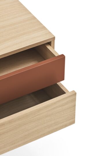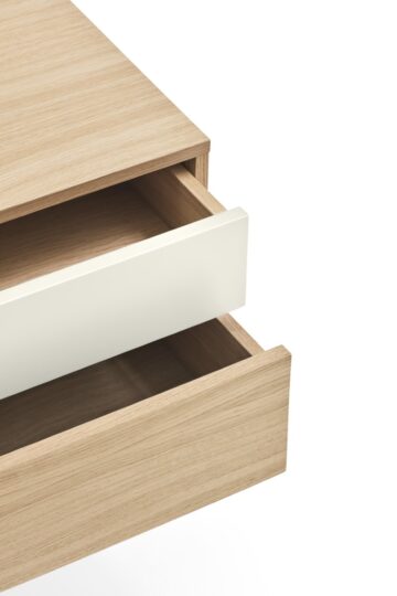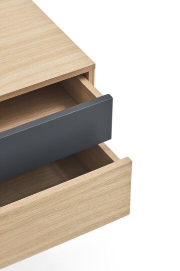 - Materijali: Korpus je u potpunosti izrađen od prirodnog hrastovog furnira, dok je prva ladica izrađena od MDF-a lakiranog u mat boji.