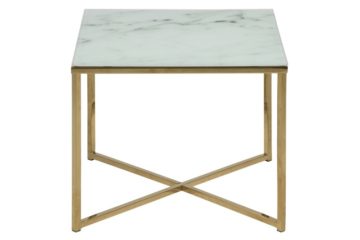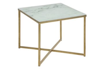 Noćni stolić Alisma 2 ima oblik kvadrata. Podnožje je kromirano, zlatne boje i ima staklenu gornju ploču koja imitira izgled bijelog mramora.