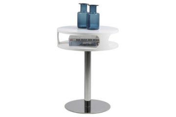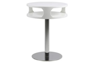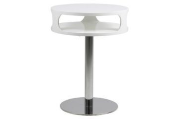 Noćni stolić Caspian ima kromirano podnožje i nogicu od poliranog nehrđajućeg čelika. Gornja površina je bijele boje visokog sjaja i uključuje policu.