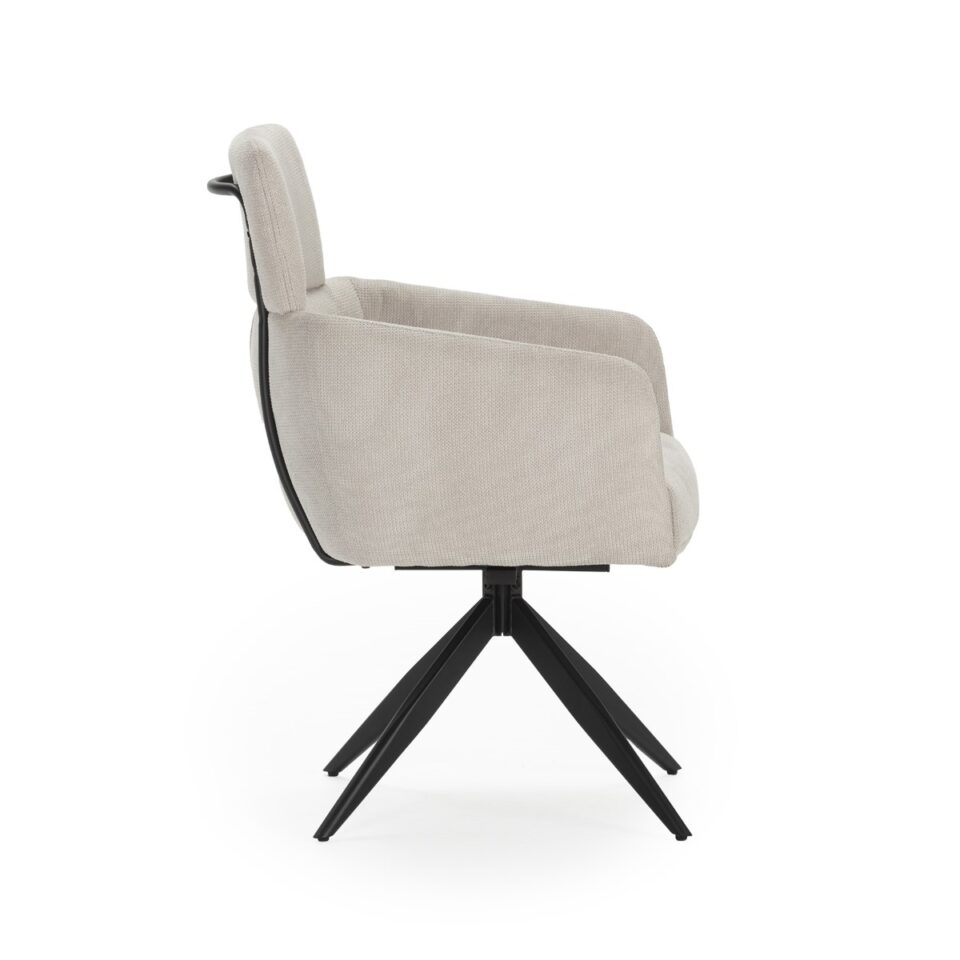 Okretna fotelja AIXA izrađena je od kvalitetne tkanine koja osigurava mekoću i udobnost pri sjedenju. Crne metalne noge pružaju stabilnost i dugotrajnost, dok okretna funkcija omogućuje lako kretanje i pristup iz svih kutova.