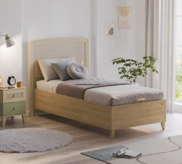- Krevet je dostupan u dvije veličine: za madrac dimenzija 100 x 200 cm ili 120 x 200 cm, što omogućuje prilagodbu različitim potrebama i prostorima.