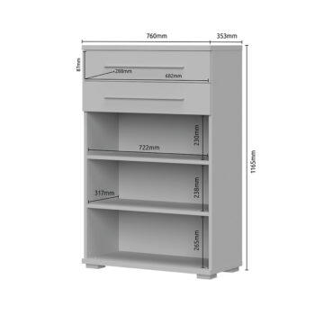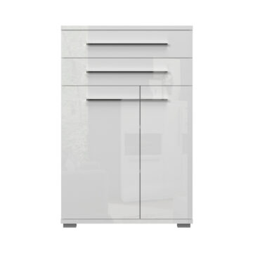 Ormar je u potpunosti u bijeloj boji sjaja. Površina je UV lakirana i time otpornija na ogrebotine kao i na sunčevu svjetlost. Bočne stranice su debljine 18 mm, a strop i dno 25 mm. Vrata i ladice imaju mehanizam za meko zatvaranje. U ormaru se nalaze dvije police i dvije ladice. Podesive noge i ručka su u potpunosti kromirane. Ormar je dio bogate kolekcije Piano predsoblja koje možete sastaviti po vašim željama.