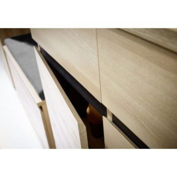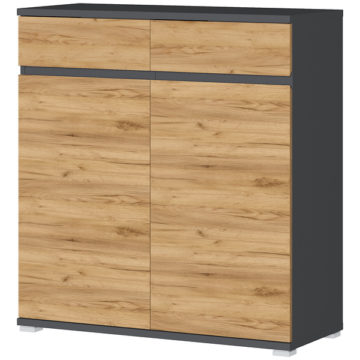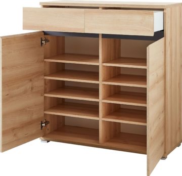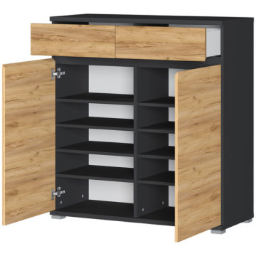 Ormarić za cipele Lissabon ima korpus i fronte od oplemenjene iverice E1 kvalitete. Ormarić uključuje dvoja vrata i dvije ladice sa sistemom mekog zatvaranja. U njemu je dovoljno prostora za 20 pari cipela. Rubovi su ABS.