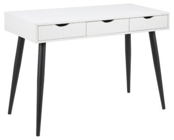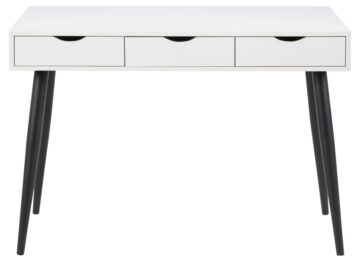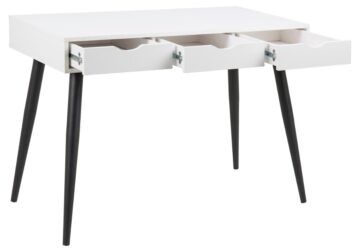 Pisači stol Neptun donosi jednostavnost i funkcionalnost u vaš radni prostor s čistim linijama i stožcastim nogama. S vrhom od bijele melaminske površine i podnožjem od mat crnog prašno lakiranog čelika, ovaj stol osigurava stabilnost i moderni izgled. Prostrana površina nudi dovoljno mjesta za prijenosno računalo, knjige i osobne predmete, dok tri ladice omogućuju jednostavno pohranjivanje.
