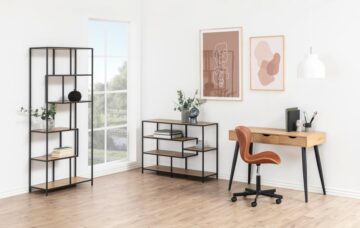 - Materijali: Gornja površina i ladice od mat divljeg hrasta, podnožje od crnog prašno lakiranog čelika