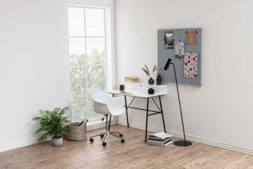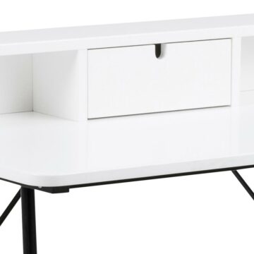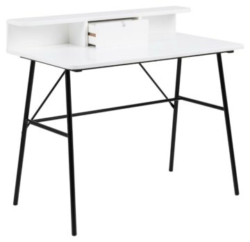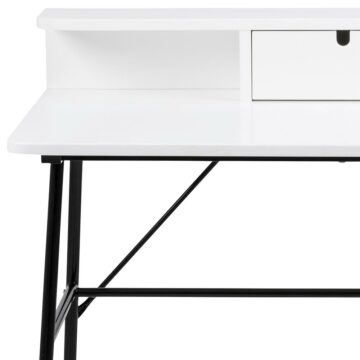 Pisaći stol Pascal je izrađen od drva i lakiran na mat bijelu boju. Ima metalno podnožje crne boje. Stol uključuje jednu ladicu.