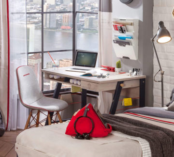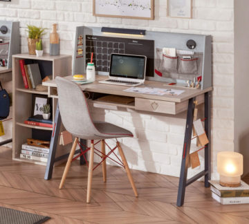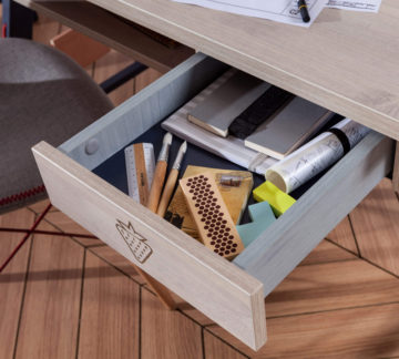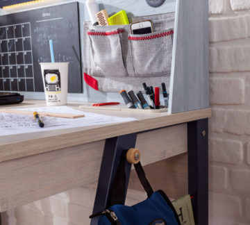 Sa strane ima i žice na koje možete staviti knjigu i kuku za vješanje torbe. Nudi dovoljno prostora za pohranu bilježnica, olovaka i ostalog pribora. Zaštićen je sa melaminom, otpornim na ogrebotine i prašinu.