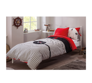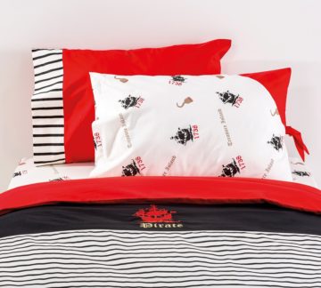 Posteljina Pirate je izrađena od najfinijeg pamuka. Posteljina se sastoji od dušečnog čaršafa, jorganske navlake i dve jastučnice. Pogodna je za korišćenje u krevetima, čije su dimenzije dušeka 90×190 cm, 90×200 cm, 100×200 cm i 120×200 cm.