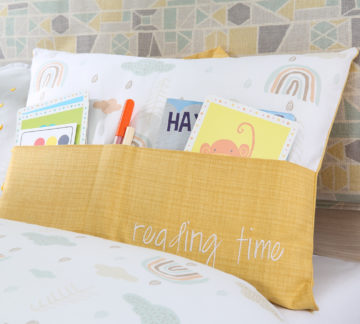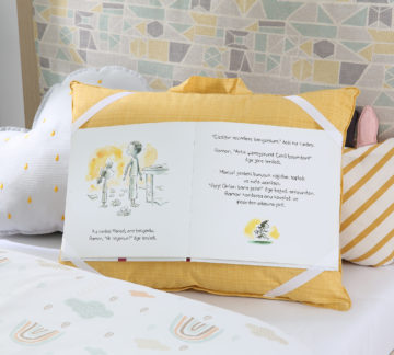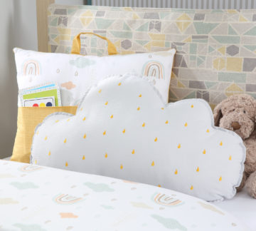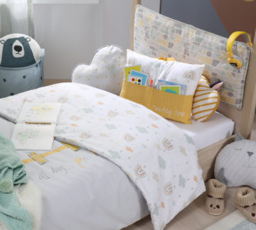 Posteljina je izrađena od pamuka u nježnoj kombinaciji boja. U cijenu su uključeni posteljina i dva ukrasna jastuka, i to jastuk u obliku oblaka i jastuk koji ima džepove za odlaganje knjiga i olovaka, a sa zadnje strane tračice koje omogućuju držanje knjige tijekom čitanja.