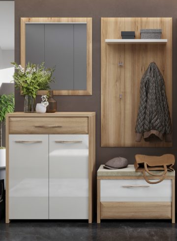 Predsoblje Milla GALA je kvalitetan i elegantno izrađen namještaj. Ima meko zatvaranje vrata i ladica. Fronte su izrađene od medijapana (MDF) lakiranog u bež s dodatkom boje pacifičkog oraha. Oblik ručki daje dodatnu eleganciju. Program GALA se može sastaviti po želji jer na raspolaganju imate pojedinačne elemente koje možete kupiti zasebno i sami sastaviti željeni sklop.