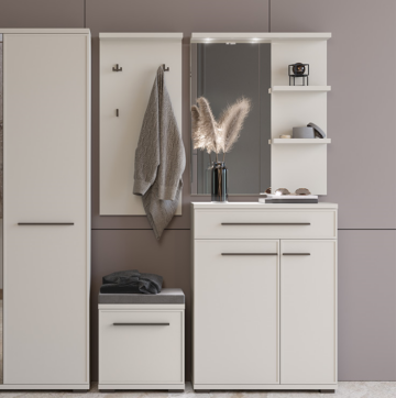 Predsoblje Milla Opera Sestav 3 namijenjeno je onima koji u svom ulaznom prostoru traže spoj funkcionalnosti i stila. Ovaj set uključuje ormar s izvlačnom šipkom za vješanje, mali ormarić koji služi i kao udobna klupa s jastukom, prostrani ormarić za cipele s jednom ladicom i dvije police, zid za vješalice s četiri vješalice i elegantno ogledalo s policama i LED rasvjeta. Svi elementi izrađeni su od visokokvalitetnih materijala u mat kašmir boji i opremljeni mekim zatvaranjem koji osigurava tiho i ugodno korištenje. Debljina dna i stropa korpusa je 2,5 cm, a debljina samih tijela je 1,8 cm, što kompoziciji daje čvrstoću i trajnost.