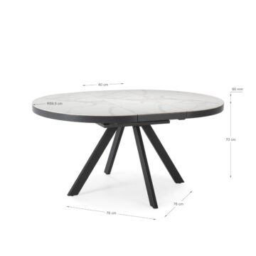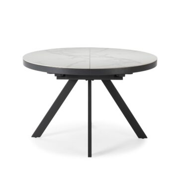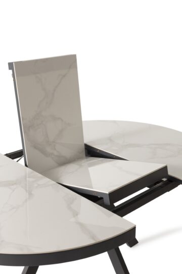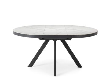 Blagovaonski stol BELA je proširivi okrugli stol promjera 120 cm s keramičkom gornjom površinom. Keramička ploča osigurava otpornost na ogrebotine i mrlje te omogućuje jednostavno čišćenje. Stol je prikladan za različite blagovaonice, jer se njegov jednostavan i elegantan dizajn savršeno uklapa u moderne i klasične interijere. Proširiva funkcija omogućuje prilagodbu različitim potrebama, pružajući dodatni prostor za goste tijekom posebnih prilika.