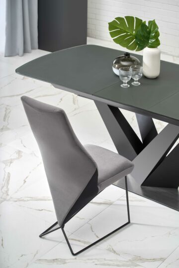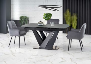 Razvučni blagovaonski stol Patrizio u kombinaciji tamnosivog stakla i crnog postolja spaja eleganciju i funkcionalnost. Zahvaljujući mehanizmu razvlačenja, duljina se lako povećava sa 160 na 200 cm, što ga čini idealnim za obiteljska okupljanja i druženja.