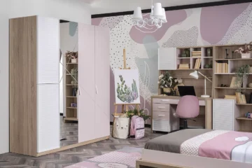 Sastav mladenačke sobe Angel 2 je dizajniran da zadovolji sve potrebe mladih po prostoru koji je funkcionalan, udoban i estetski privlačan. Nudi široki spektar rješenja za pohranu i radne površine, dok održava nježno i svježe ozračje kombinacijom bijelih, prirodnih i roza tonova. Ovaj sastav je savršen izbor za stvaranje poticajnog i organiziranog okruženja koje potiče učenje, rast i opuštanje.