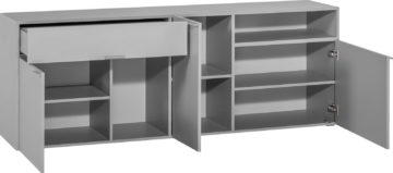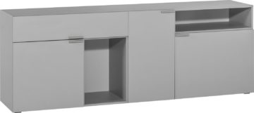 Komoda ima tri vrata i jednu ladicu koje imaju meko zatvaranje. Izrađena je od kvalitetne iverice zaštićene vrhunskim melaminom. Dostupan je u bijeloj ili sivoj boji. Dimenzije (dužina x dubina x visina): 145 x 42 x 118,50 cm.