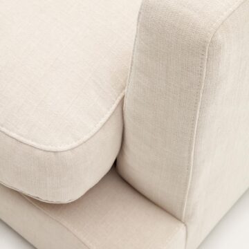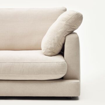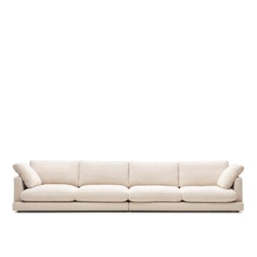 Kutna garnitura Gala u bež boji – širine 390 cm odlikuje se modernim dizajnom sa zaobljenim linijama i nježnim prirodnim tonovima, što je čini savršenim dodatkom svakoj dnevnoj sobi. Izrađena je od kvalitetnih materijala, uključujući reciklirana vlakna i borovo drvo, što je čini stilskom i ekološki prihvatljivom opcijom.