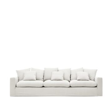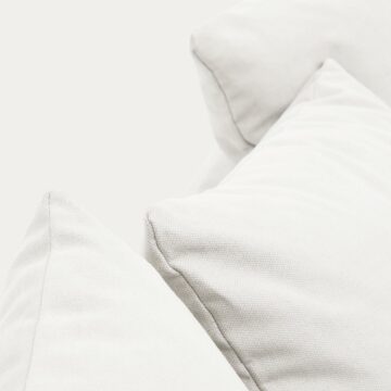 Kutna garnitura Nora s jastucima u ecru boji – 340 cm ističe se ravnim linijama i prostranim dimenzijama, koje se savršeno uklapaju u veće dnevne boravke. Izrađena je od kvalitetnih materijala, uključujući 30% borovine, poliuretanskih vlakana i recikliranih materijala, što joj daje dugotrajnost i udobnost.