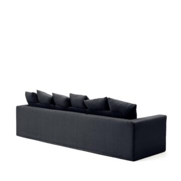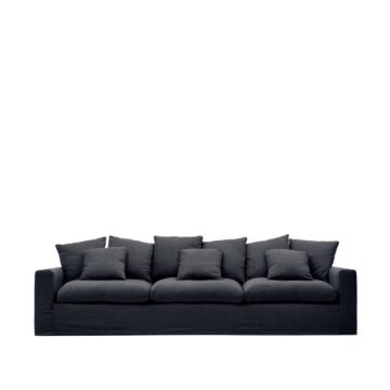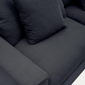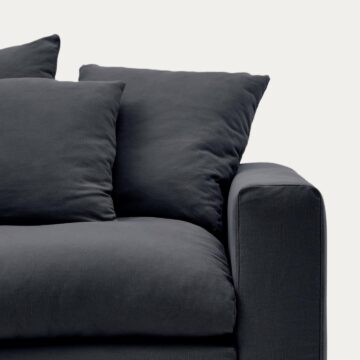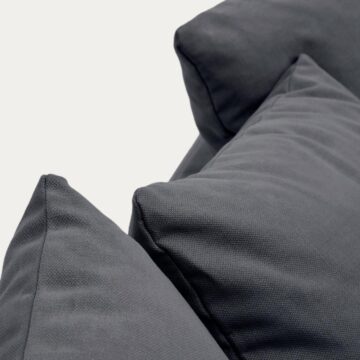 Kutna garnitura Nora s jastucima u sivoj boji – 340 cm ističe se modernim dizajnom i estetski privlačnim kombinacijama materijala, uključujući laneno i pamučno platno u antracit sivoj boji. Sa širinom od 340 cm i dubinom od 104 cm, idealna je za prostrane dnevne boravke te pruža dovoljno mjesta za udobno sjedenje.