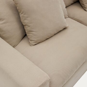 Sedežna garnitura Nora z blazinami v taupe barvi – 340 cm se ponaša z ravnimi linijami in prostornimi dimenzijami, ki se odlično prilegajo vsaki prostorni dnevni sobi.
