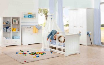 - krevetić za madrac dimenzije 70 x 140 cm sa stranicama pomoću kojih možete kolijevku pretvoriti u mali krevet, na ogradici su tri letvice koje možete makuti