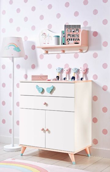 Sastavom Magični jednorog soba postaje zemlja bajki. Impresivan dizajn bajkovitog jednoroga i tople te slatke boje, usrečiti če svako dijete. Uz magičan izgled odlikuje se i jednostavnim korištenje te velikom kapacitetom za pohranu. Namještaj napravljen je od oplemenjene iverne ploče E1 kvalitete, debljine 18mm i 25mm. Vrata i ladice funkcioniraju na sistem mekog zatvaranja. Šipka za vješalice ima LED svjetlo sa senzorom.