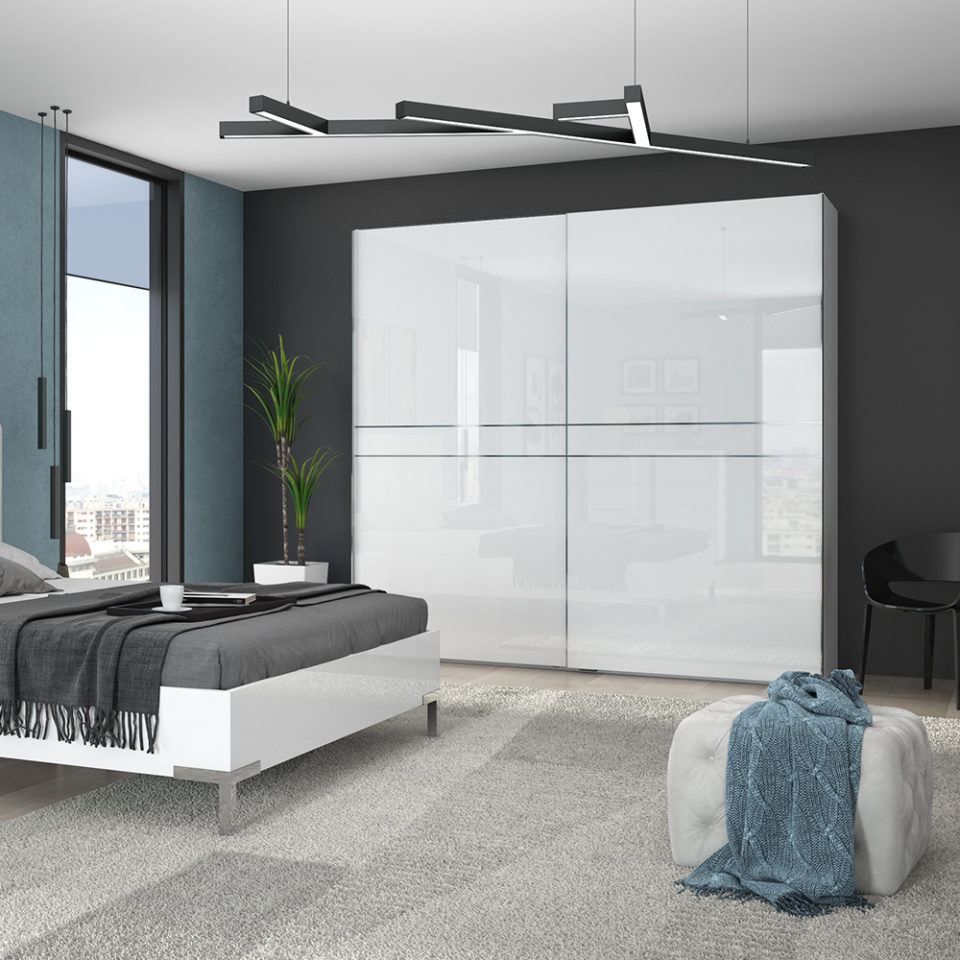 Elegantna Piano spavaća soba u visokom sjaju. Sastav možete odabrati u bež ili bijelom laku. Namještaj iz serije Piano spavaćih soba ima ugrađen mehanizam za meko zatvaranje, Hettich okove i kromirane ručke. Sastav sadrži.