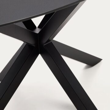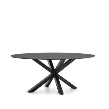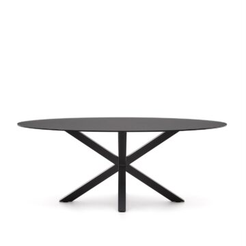 Stakleni ovalni blagovaonski stol Argo spaja profinjen dizajn i vrhunske materijale. Stol je savršen izbor za moderne prostore, jer njegova crna površina od kaljenog stakla i križno dizajnirana baza od crno lakiranog čelika donose izvanrednu kombinaciju estetike i funkcionalnosti. S dimenzijama 200 x 100 cm pruža dovoljno prostora za do osam osoba, što je idealno za obiteljske ručkove i druženja s prijateljima.