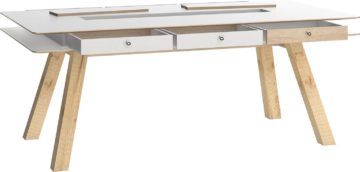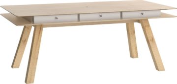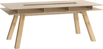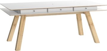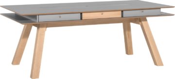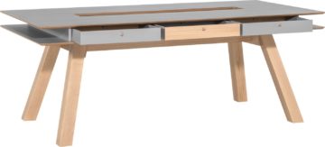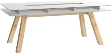 Stol je dimenzija 200 x 100 cm i visine 76 cm. Dostupan je s bijelom, sivom ili hrastovom pločom, a noge su hrastove boje. Izrađena je od iverice i zaštićena je melaminskom zaštitom.
