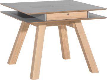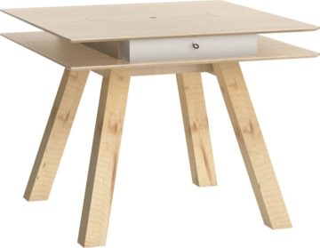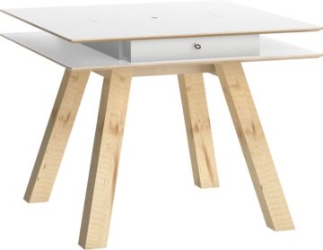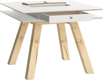 Stolić je dimenzije 100 x 100 cm i visine 76 cm. Ploča stolića može biti bjela, siva ili u boji hrasta, noge u hrast boji. Središnji dio ploče može se otvoriti i prostor koristiti za različite namjene (pogledajte video).