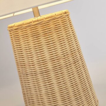 Stolna svjetiljka Kimjit prirodnog i autentičnog je izgleda. Mutnim osvetljenjem stvara mirnu i ugodnu atmosferu. Ručno pletena baza, izrađena od prirodnog ratana, tople i ugodne je nijanse. Sjenilo je pamučno. Žarulja (E27) nije uključena u cijenu.