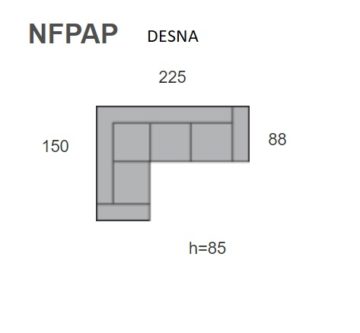 Dimenzije garniture su 225 x 150 x 85 cm. Dubina sjedala je 88 cm, a sjedala 55 cm. Visina sjedala je 43 cm.
