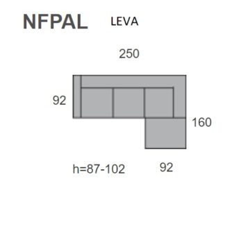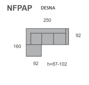 Dimenzije garniture su 250 x 160 x 87-102 cm. Dubina sjedala je 92 cm, a sjedala 55 cm. Visina sjedala je 43 cm.