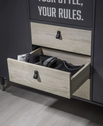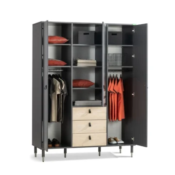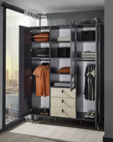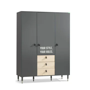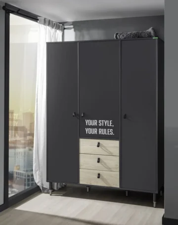 Trodijelni ormar iz kolekcije Moto nudi prostrano i organizirano rješenje za pohranu koje je dizajnirano da se skladno uklopi u moderne mladenačke sobe, nudeći funkcionalnost i stilsko savršenstvo koji nadopunjuju svaki prostor.