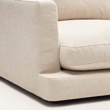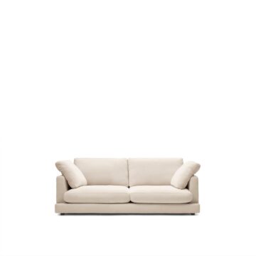 Trosjed Gala u bež nijansi ima dimenzije 210 cm širine, 105 cm dubine i 87 cm visine, što omogućuje udobno sjedenje za više osoba. Tapecirana baza s integriranim naslonima za ruke i leđa pruža izvrsnu potporu, dok je punjenje izrađeno od visokokvalitetne poliuretanske pjene i recikliranih vlakana.