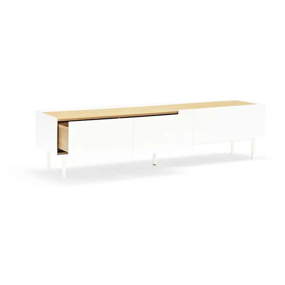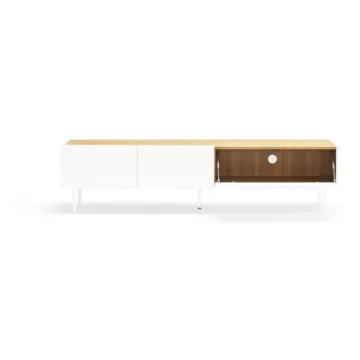 Tv komoda – ormarić Arista izrađen je od mat bjele MDF ploče. Njegov izgled dopunjuje furnir prirodnog hrasta. Metalne noge visine su 18 centimetra. Maksimalna nosivost ormarića je 30 kg.