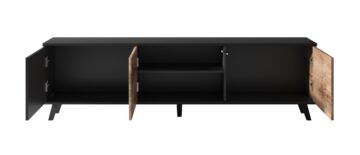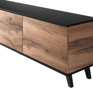 Zatvoreni TV ormarić s troja vrata. Dizajniran u modernom i elegantnom stilu, u kombinaciji hrasta i crne boje. Sastoji se od plastičnih nogica i okvira od mat laminirane iverice. Dostupan je u dvije verzije koje se razlikuju po položaju crnih vrata.