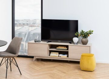 Tv komoda – ormarić Marte je izrađen od masivnog hrasta i hrastovog furnira te dodatno zaštićen bijelo pigmentiranim uljem. Ormarić uključuje dvoja vrata i jednu policu.