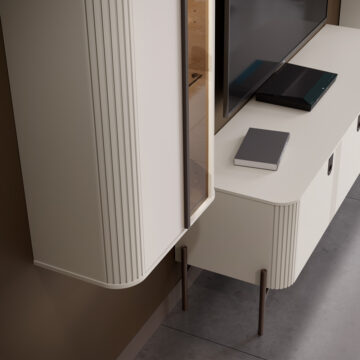 TV ormarić iz kolekcije Rondo spaja sofisticiranu estetiku i funkcionalnost, što ga čini idealnim izborom za moderne dnevne sobe. Kombinacija kašmir mat dekora i duhanskog hrasta stvara uravnotežen i elegantan ambijent.