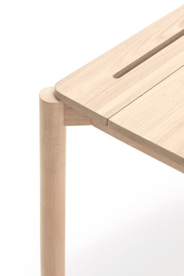 - Dizajn: Četiri blago pomaknute cilindrične noge podupiru pravokutnu ploču stola, stvarajući stabilnu i vizualno privlačnu konstrukciju.